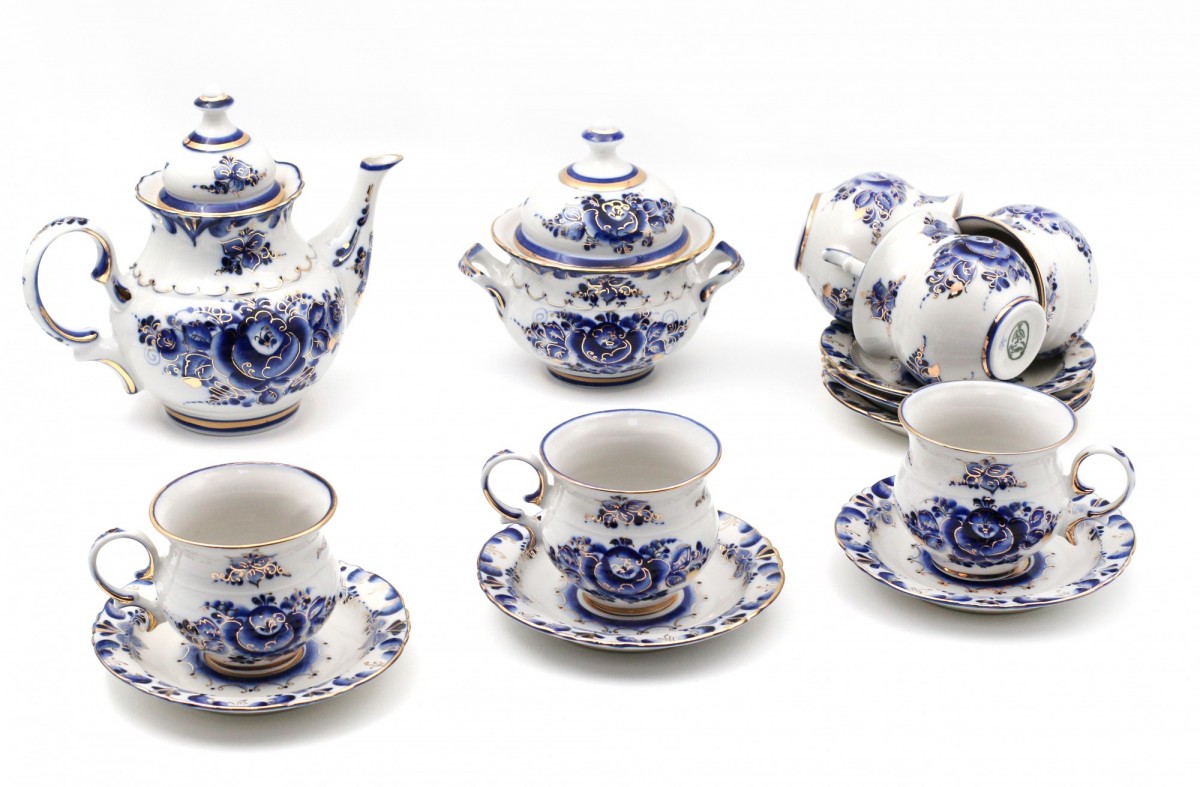 Красивый чайный сервиз, где кобальтовая роспись великолепно дополнена золотом, что делает его еще красивее и привлекательнее.