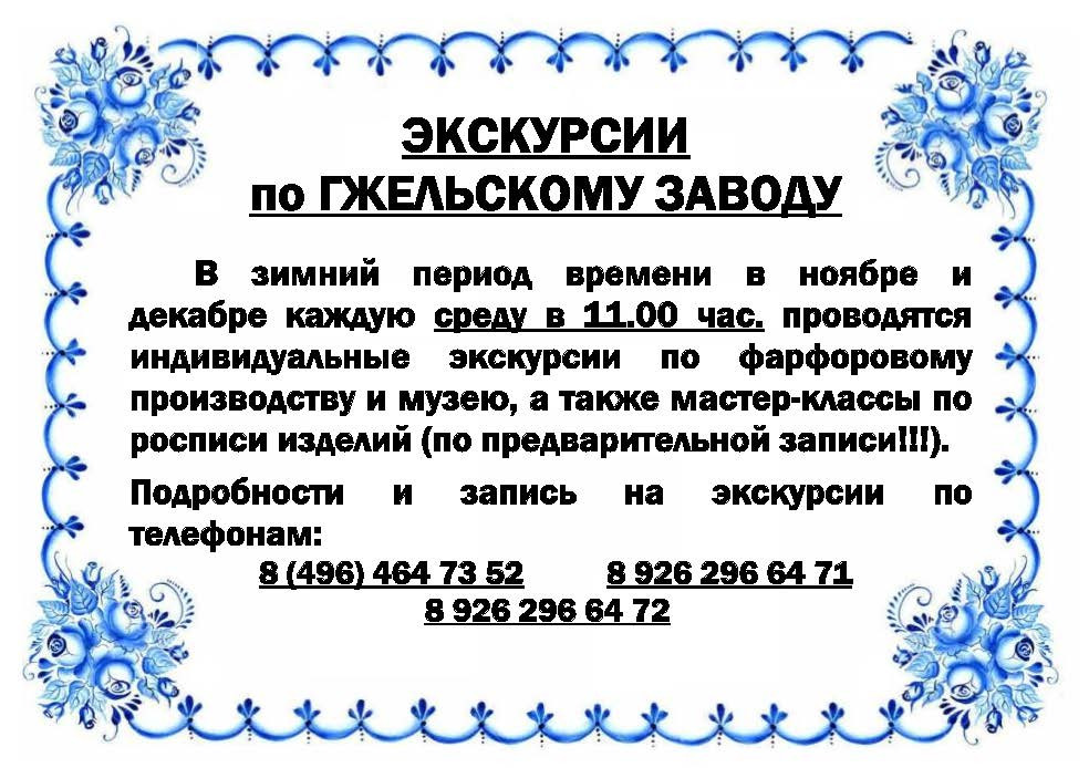 ЭКСКУРСИИ по ГЖЕЛЬСКОМУ ЗАВОДУ, МАСТЕР – КЛАССЫ →