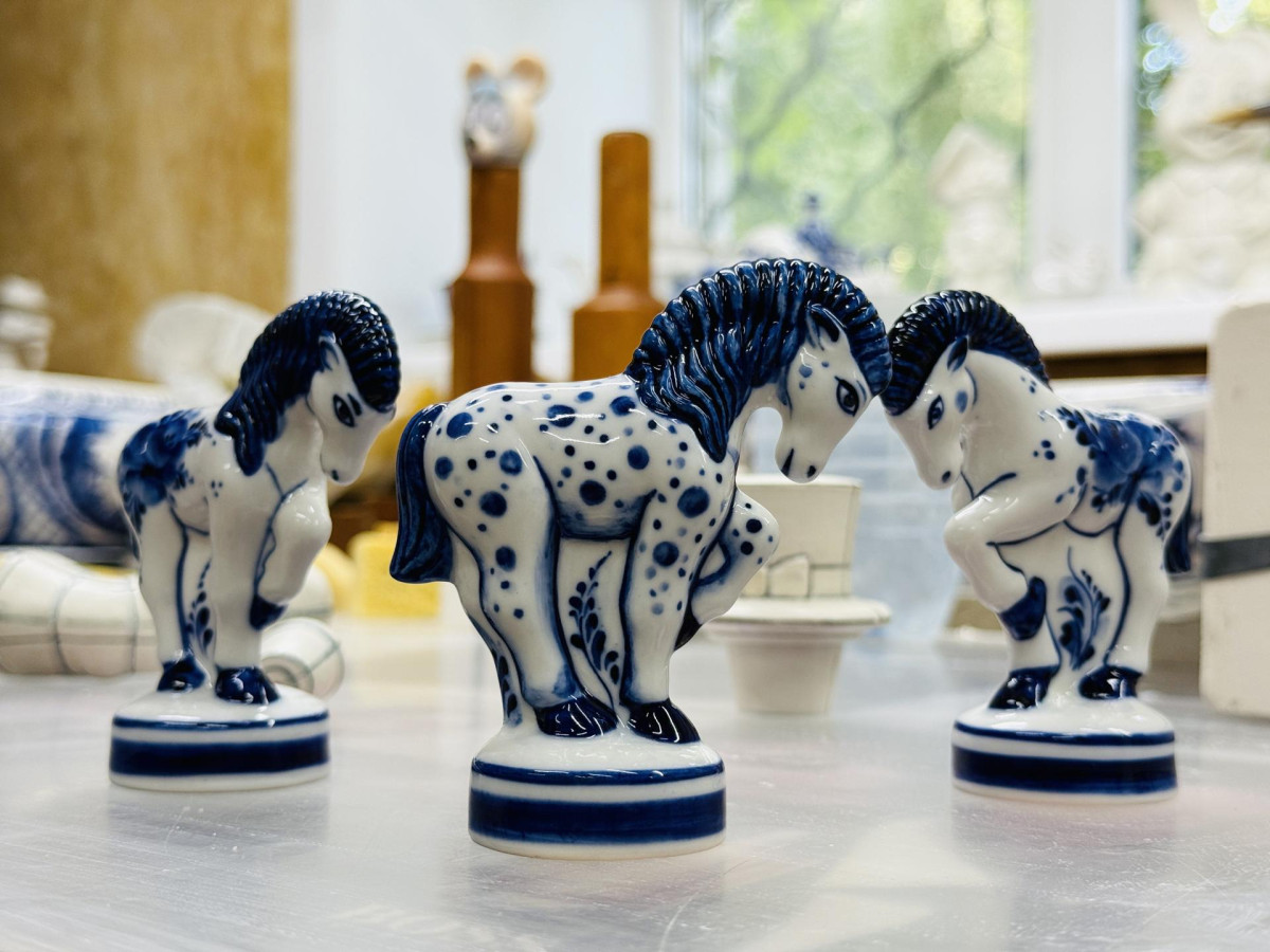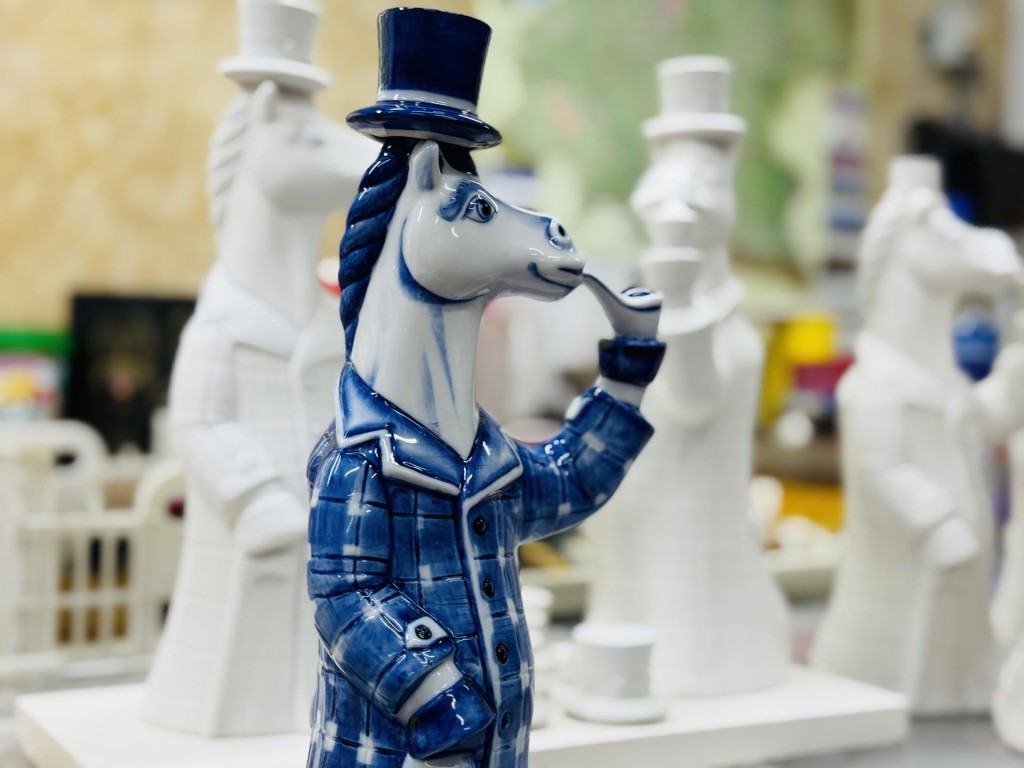 «Готовь сани летом», — подумали на Гжельском заводе художественной росписи и уже сейчас озаботились новогодними подарками. Несмотря на то, что до праздников еще несколько месяцев, на предприятии кипит работа: художники создают уникальные сувениры, которые станут хитами предстоящего сезона. Главной новинкой года станет графин «Конь в пальто», посвященный символу 2026 года — Лошади. Автор формы, скульптор-модельщик Эдуард Гаврилов, разработал целую серию вариаций этого необычного изделия. «Каждый конь имеет свой характер: один с трубкой в духе Шерлока Холмса, другой с гжельской кружкой, третий — с изящной бабочкой. Расписаны также по-разному», — рассказывает художник. Особое внимание уделено деталям: пальто украшено разнообразными узорами, пуговицами и хлястиками, что делает каждый экземпляр уникальным
