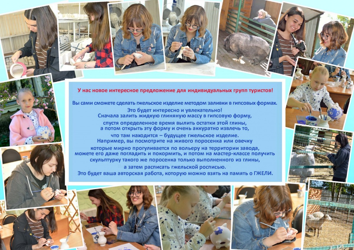 У нас новое интересное предложение для индивидуальных групп туристов. Вы сами сможете сделать гжельское изделие методом заливки в гипсовых формах. Это будет интересно и увлекательно! Сначала залить жидкую глиняную массу в гипсовую форму, спустя определенное время вылить остатки этой глины, а потом открыть эту форму и очень аккуратно извлечь то, что там находится – будущее гжельское изделие. Например, вы посмотрите на живого поросенка или овечку, которые мирно прогуливается по вольеру на территории завода, можете его даже погладить и покормить, и потом на мастер-классе получить скульптурку такого же поросенка, только выполненного из глины, а затем расписанного гжельской росписью. Это будет ваша авторская работа, которую можно взять на память о ГЖЕЛИ.