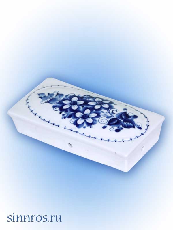 Изразец с овалом внутри. В этом овале размещается рисунок – небольшой цветок, по краям овала можно сделать нежную кружевную сеточку, на уголках изразца разместить гжельский мазок в виде лепестков.