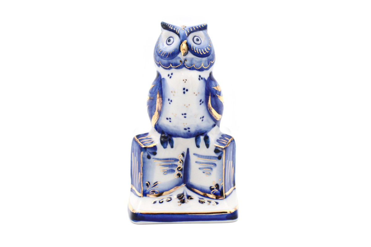 Гжельская умная сова — интересная скульптура в росписи золотом.