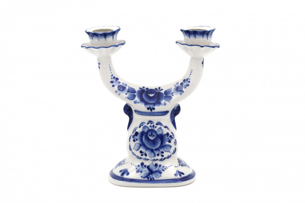 Интересный подсвечник на две свечи, который великолепно дополнит вашу коллекцию гжельских изделий.