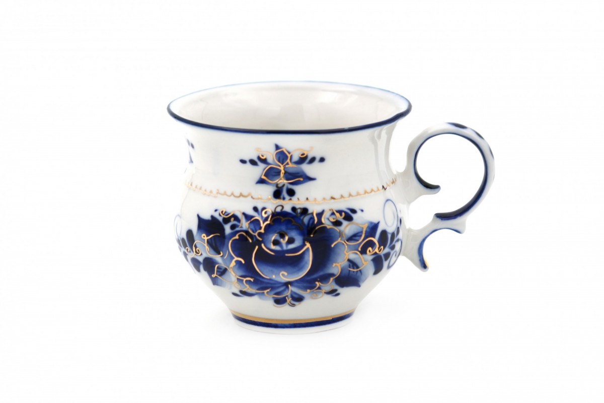 Классическая форма чашки, гжельская роспись кобальтом и декорирование золотом делают очень удобной и привлекательной эту чашку.