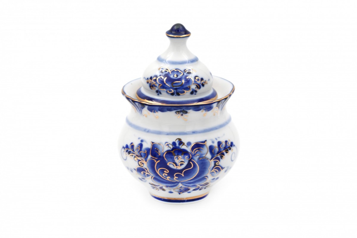 Роспись кобальтовая здесь дополнена золотом, поэтому изделие еще красивее. Предназначена для хранения сыпучих продуктов.