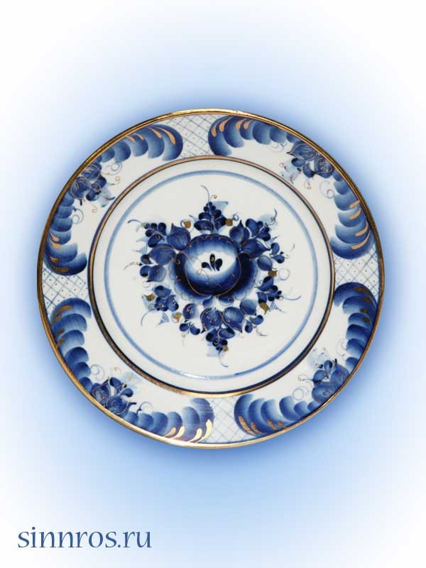 Столовая тарелка для первых блюд с красивой гжельской роспись, декорированная золотой краской. Может использоваться в сервизе.