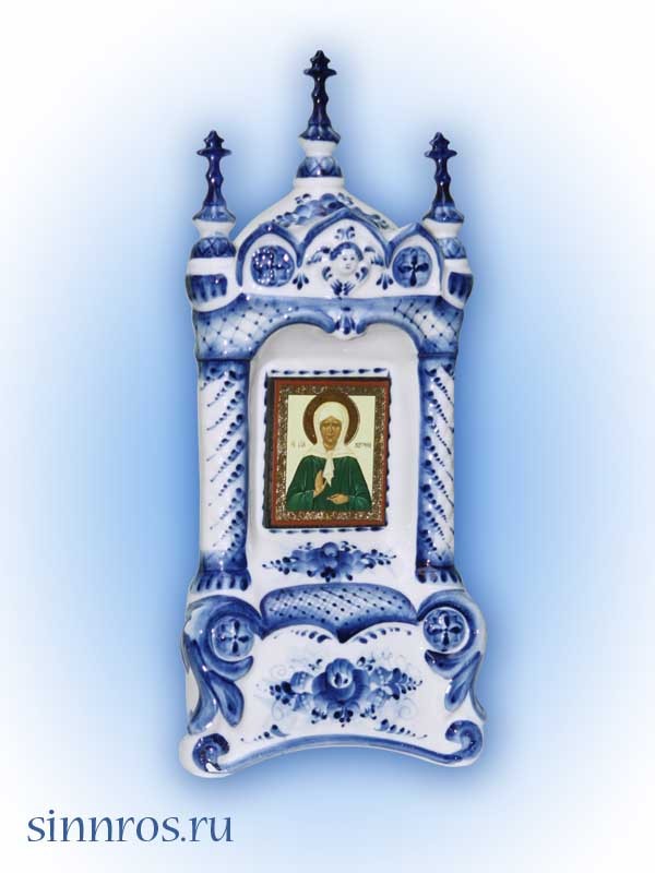 Гжельский красивый киот действительно украсит ваш дом, подчеркнет вашу индивидуальность, (иконка может быть любая). Роспись на этом изделии выполнена кобальтовой краской мазками, тенями — гжельская.