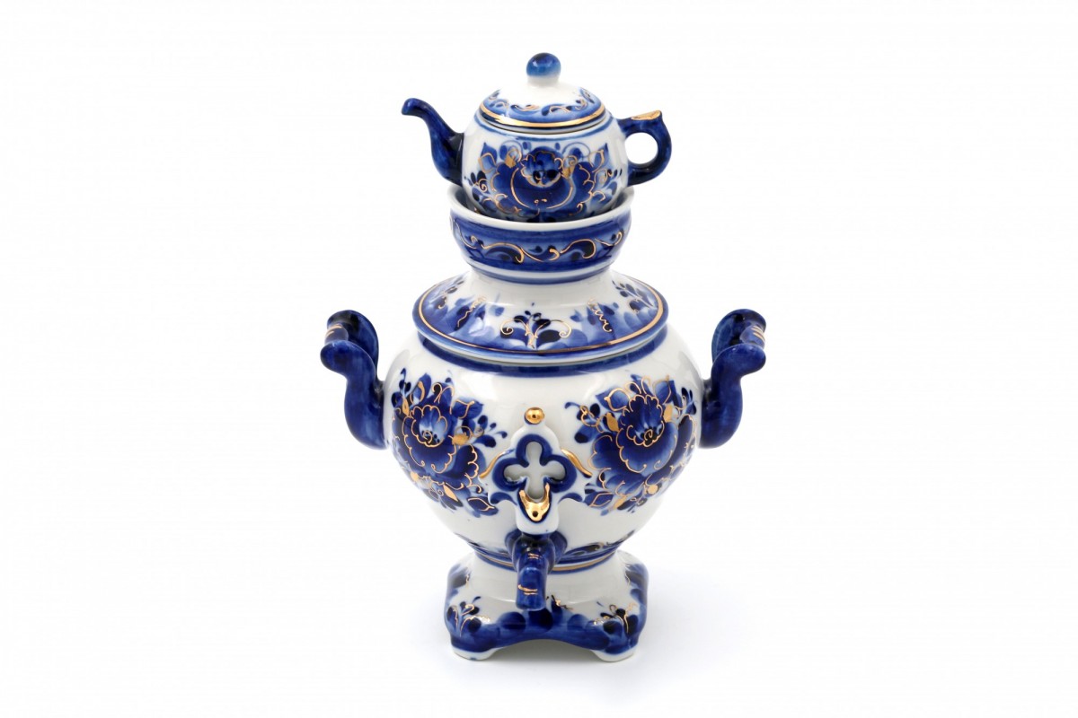 Это изделие, где кобальтовая роспись дополнена золотом стало визитной карточкой Гжели — никогда не выйдет из моды, всегда этот самовар покупают.
