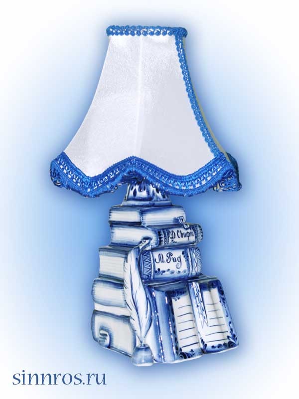 Великолепный настольный светильник интересной формы и гжельской росписью. Абажур из белого шелка с красивой голубой или синей тесьмой