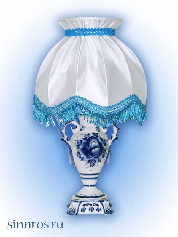 Красивая гжельская роспись и продуманная форма обеспечили этому светильнику хорошую покупательскую возможность. Абажур может быть другой