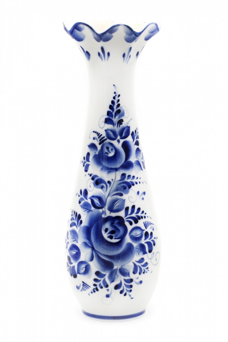 Интересная форма вазы для цветов подчеркнута красивой гжельской росписью.