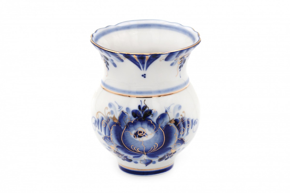 Невысокая, но объемная ваза. Роспись кобальтовой краской дополнена золотом, что значительно украшает ее.